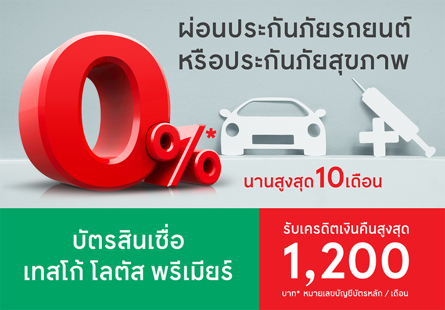 บัตรสินเชื่อเทสโก้ โลตัส พรีเมียร์ ผ่อนประกันภัยที่ร่วมรายการ 0%* นานสูงสุด 10 เดือน+รับเครดิตเงินคืนสูงสุด 1,200 บาท* /เดือน