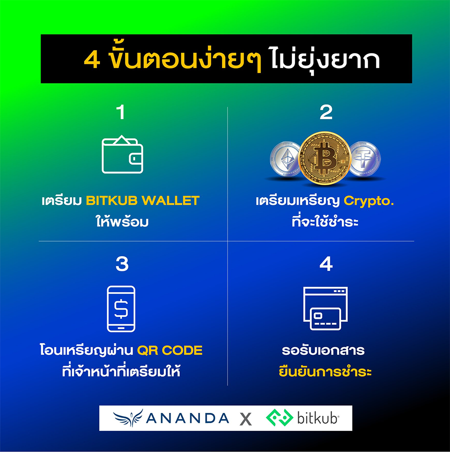 ในปัจจุบันตลาดคริปโทฯ ได้รับความสนใจมากขึ้นเรื่อยๆ เพราะด้วยมูลค่าของตลาดคริปโทฯ มีที่เติบโตขึ้นอย่างก้าวกระโดดโดยเฉพาะในปีนี้ที่มูลค่าของเหรียญ BITCOIN : BTC ขึ้นไปสู่จุดสูงสุดที่เกิน 2,000,000 บ. ต่อ 1 เหรียญ BTC แสดงให้เห็นว่าวิถีการลงทุนในทรัพย์สินของคนยุคดิจิทัลได้เปลี่ยนไป โดยการยอมรับสกุลเงินดิจิทัลในครั้งนี้ คือการส่งเสริมวิถีชีวิตแบบไร้เงินสด เปิดโอกาสให้ผู้คนสามารถชำระค่าใช้จ่ายในการซื้อขายบ้านและคอนโดมิเนียมจากอนันดาฯ ผ่านคริปโทฯ ได้ โดย อนันดาฯ เปิดรับเงินสกุลคริปโทฯ ที่ได้รับการยอมรับในตลาดโลก 3 สกุลประกอบด้วย Bitcoin: BTC*, Ethereum: ETH* และ Tether USD: USDT* ทั้งนี้ ในความร่วมมือดังกล่าวเป็นการเพิ่มโอกาสในการซื้อขายบ้านและคอนโดมิเนียมด้วยการชำระเงินผ่านสินทรัพย์ดิจิทัล โดยมี 4 ขั้นตอนง่ายๆ ดังนี้