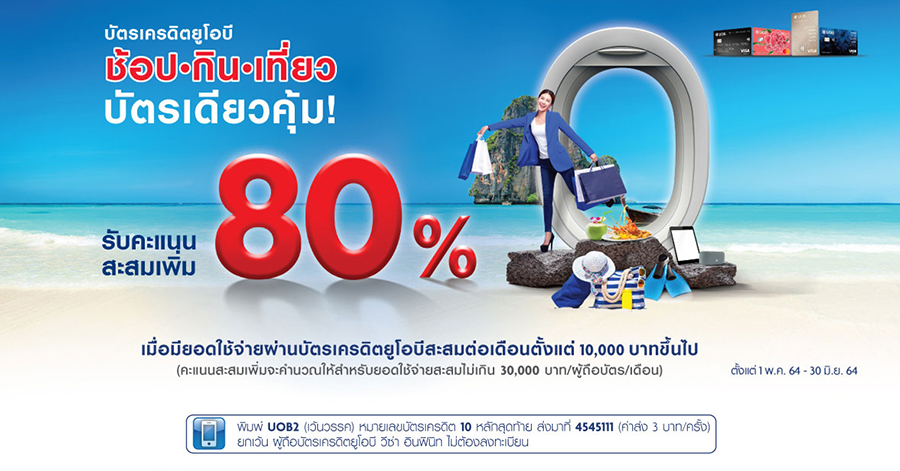 เงื่อนไขการรับคะแนนสะสมเพิ่ม 80% - รายการส่งเสริมการขายนี้ระหว่างวันที่ 1 พฤษภาคม 2564 - 30 มิถุนายน 2564 เฉพาะบัตรเครดิตยูโอบีที่ออกในประเทศไทยเท่านั้น (ยกเว้นบัตรเครดิตเพื่อธุรกิจ และบัตรเครดิต TMRW) โดยผู้ถือบัตรจะต้องคงสถานะการเป็นสมาชิกบัตรและไม่ผิดนัดชำระเงินจนถึงวันที่ธนาคารบันทึกคะแนนสะสม / เครดิตเงินคืน เข้าบัญชีบัตรเครดิต