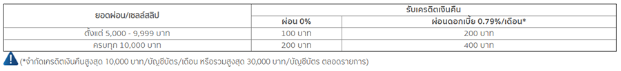 - เครดิตเงินคืนคำนวณยอดผ่อนตั้งแต่ 5,000 บาทขึ้นไป ต่อเซล์ลสลิปและผ่อนนาน ตั้งแต่ 3 เดือนขึ้นไป