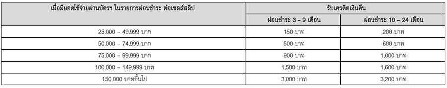 *ขอสงวนสิทธิ์ยกเว้นการมอบคะแนนทุกประเภท สำหรับยอดใช้จ่ายผ่านบัตรฯ ที่นำมาคำนวณเพื่อมอบเครดิตเงินคืนตามรายการนี้