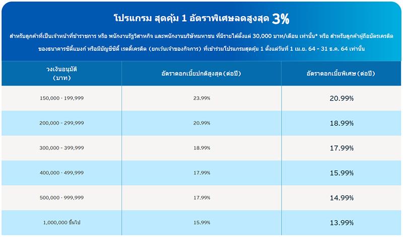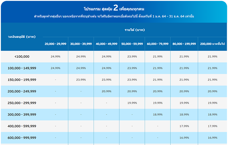 - บริษัทฯ ขอสงวนสิทธิ์ในการใช้หลักเกณฑ์และนโยบายภายในของบริษัทในการอนุมัติวงเงิน หรือปฏิเสธคำขอกู้ รวมถึงกำหนดอัตราดอกเบี้ยพิเศษซึ่งอาจแตกต่างจากตารางข้างต้น