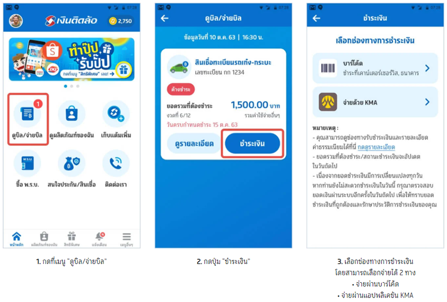 - ผู้เข้าร่วมกิจกรรมจะต้องจ่ายบิลด้วยแอปเงินติดล้อ โดยมีช่องทางการชำระเงิน ดังนี้ ชำระผ่านแอป KMA หรือชำระผ่านบาร์โค้ด ณ จุดรับชำระเงิน หรือ เคาน์เตอร์เซอร์วิส โดยนำบาร์โค้ดที่ได้จากแอปเงินติดล้อไปชำระเงินได้ที่ เคาน์เตอร์เซอร์วิส, เทสโก้ โลตัส, บิ๊กซี, เดอะมอลล์ ทุกสาขา, ATM หรือชำระผ่านทาง Internet Banking ของธนาคาร ทั้ง 15 แห่ง หรือชำระผ่านทาง Mobile Banking ของธนาคาร 13 แห่ง (รายละเอียดเพิ่มเติม คลิก)