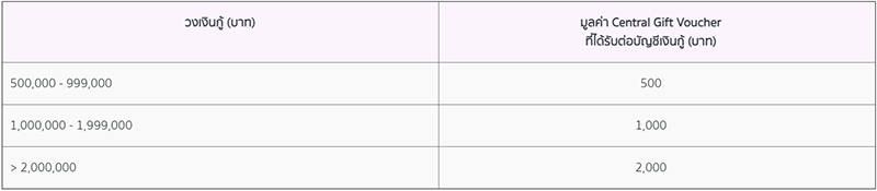 - ธนาคารจะส่ง Central Gift Voucher ภายใน 60 วันทำการ หลังจากสิ้นสุดระยะเวลาแคมเปญ โดยจะจัดส่งให้ทางไปรษณีย์ตามที่อยู่ที่แจ้งแก่ธนาคารไว้