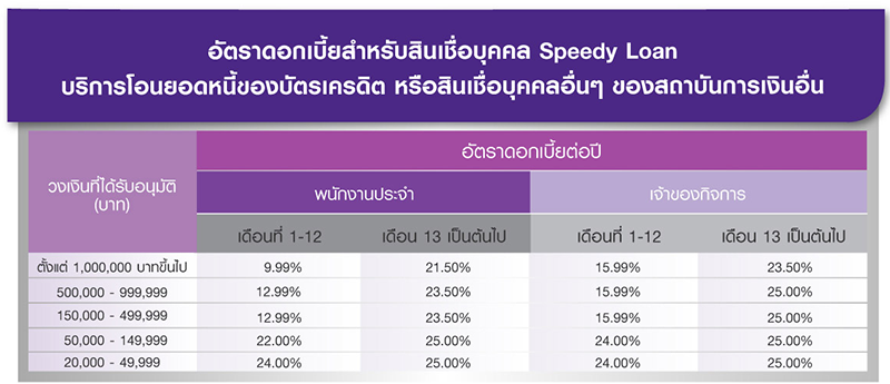 เงื่อนไขการบริการโอนยอดหนี้ของบัตรเครดิตหรือสินเชื่อบุคคลของสถาบันการเงินอื่นอัตราดอกเบี้ยสำหรับสินเชื่อบุคคล Speedy Loan เฉพาะลูกค้าที่ได้รับการอนุมัติวงเงินสินเชื่อบุคคล Speedy Loan และสมัครใช้บริการโอนยอดหนี้ของบัตรเครดิตหรือสินเชื่อบุคคลของสถาบันการเงินอื่น ระยะเวลาแคมเปญระหว่างวันที่ 1 พฤษภาคม 2564 - 30 มิถุนายน 2564