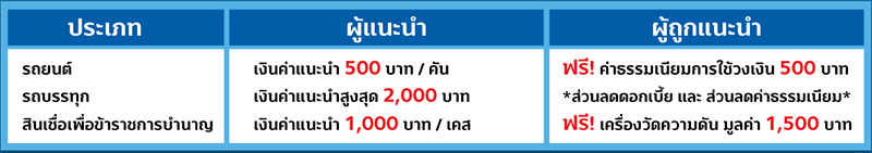 ข้อกำหนดและเงื่อนไข - ผู้แนะนำ ต้องไม่ใช่ พนักงาน หรือ ตัวแทน (Agent) ที่ต้องส่งงานสินเชื่อทะเบียนรถยนต์ และรถจักรยานยนต์ ผ่านธนาคารทิสโก้ หรือ สมหวังเงินสั่งได้ทั่วประเทศ