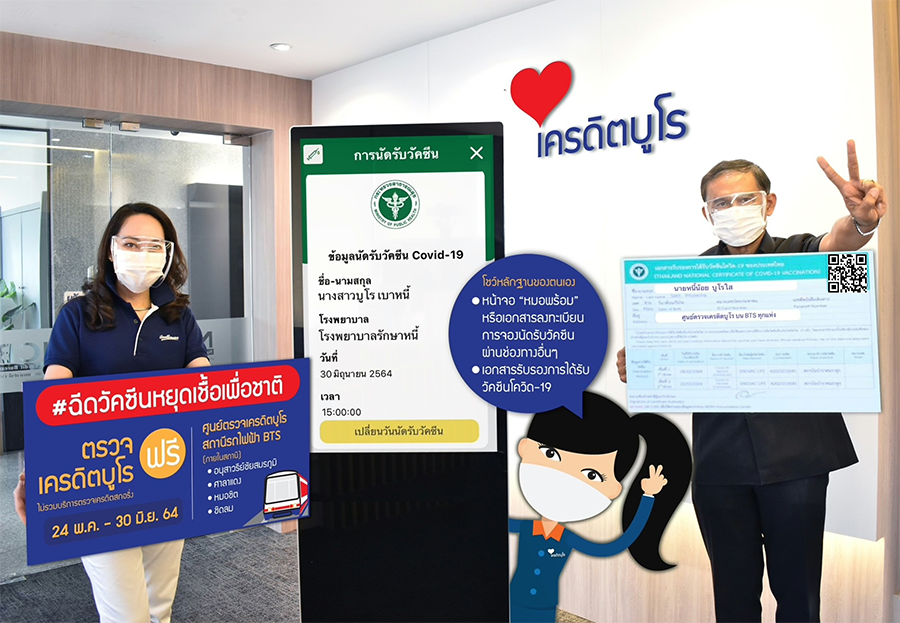 เครดิตบูโร ร่วมสนับสนุนคนไทย ตรวจเครดิตบูโร...ฟรี!!! เพียงโชว์การจองคิววัคซีนหรือเอกสารรับรองได้รับวัคซีนโควิด-19 ได้ที่ศูนย์ตรวจเครดิตบูโรบนสถานี BTS ทุกแห่ง