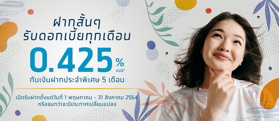 ฝากสั้นๆ รับดอกเบี้ยทุกเดือน กับเงินฝากประจำพิเศษ ระยะเวลา 5 เดือน อัตราดอกเบี้ย 0.425% ต่อปี*