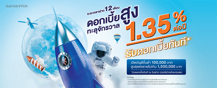 โปรโมชั่นเงินฝากประจำ 12 เดือน ดอกเบี้ยสูงทะลุจักรวาล 1.35% ต่อปี จาก ธ.ไทยเครดิต