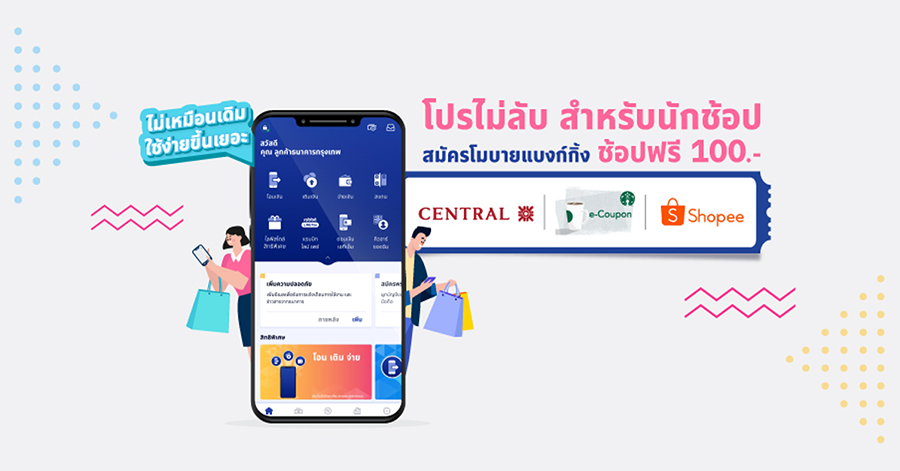 สิทธิพิเศษสำหรับลูกค้าธนาคารกรุงเทพ เลือกรับคูปองจาก Central Group Starbucks หรือ Shopee ไปช้อปฟรี 100 บาท เพียงสมัครใช้บริการโมบายแบงก์กิ้ง จากธนาคารกรุงเทพครั้งแรก และเพิ่มบัญชีบัตรเครดิต และ/หรือบัญชีกองทุน และ/หรือบัญชีสินเชื่อ อย่างน้อย 1 บัญชี