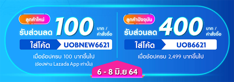 รับส่วนลด 400 บาทต่อคำสั่งซื้อ เมื่อช้อปครบ 2,499 บาทขึ้นไป (ช้อปกับ Lazada เป็นครั้งแรก รับส่วนลด 100 บาทต่อคำสั่งซื้อ เมื่อช้อปครบ 100 บาทขึ้นไป) หลังหักค่าขนส่งและส่วนลดทุกประเภท สำหรับการซื้อสินค้าที่ร่วมรายการ โดยผู้ใช้ต้องกรอกรหัส UOB6621 (ผู้ใช้ครั้งแรกกรอกรหัส UOBNEW6621) ในช่องกรอกรหัส และเลือกบัตรเครดิตยูโอบี หรือ บัตรเครดิต TMRW ก่อนทำการชำระเงินเท่านั้น
