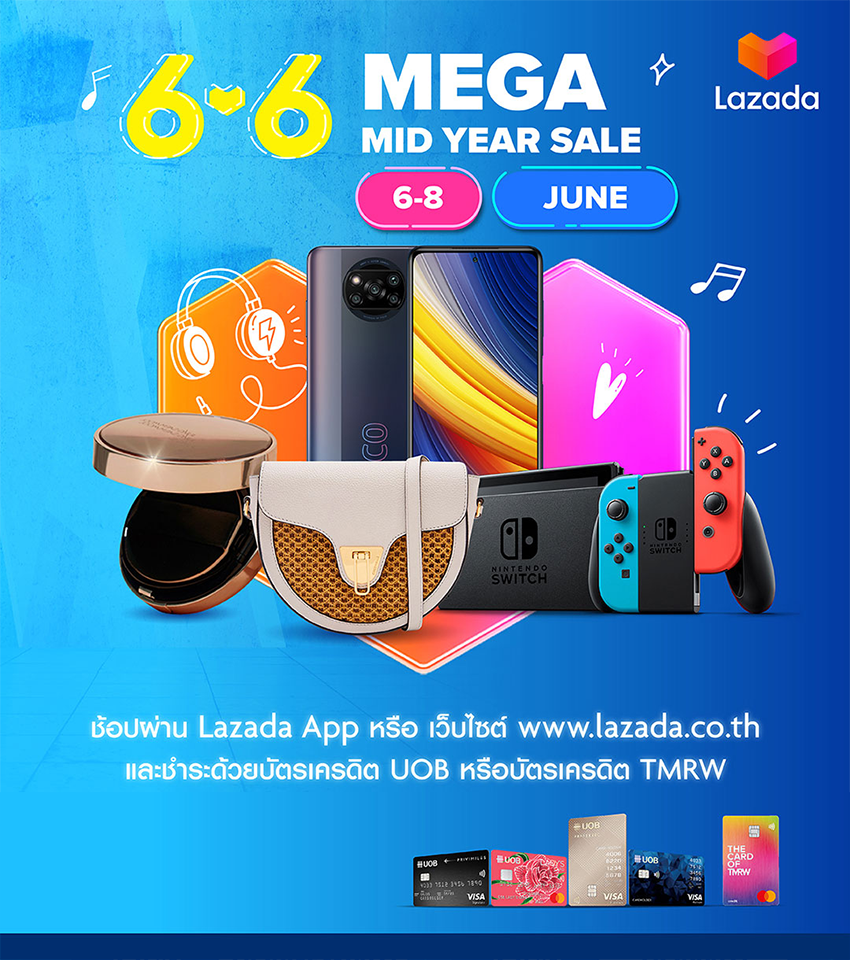 6.6 Lazada Mega Mid Year Sales สิทธิพิเศษสำหรับลูกค้าบัตรเครดิตยูโอบี รับส่วนลดสูงสุด 400 บาท*