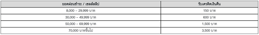**สำหรับร้านค้า Power Buy / Power Mall ต้องมียอดผ่อนชำระตั้งแต่ 6 เดือนขึ้นไป และสงวนสิทธิ์ยกเว้นการมอบคะแนนทุกประเภทสำหรับการผ่อนชำระที่ Power Buy / Power Mall