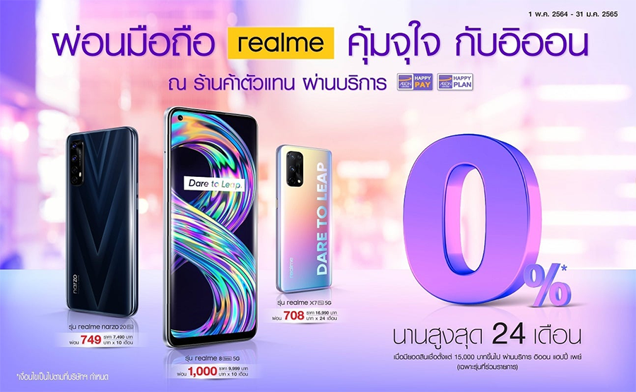 ผ่อนมือถือ REALME ดอกเบี้ย 0% นาน สูงสุด 24 เดือน ณ ร้านค้าตัวแทนที่ร่วมรายการ