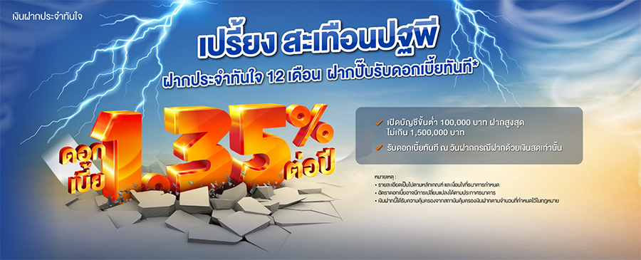 โปรโมชั่นเงินฝากประจำทันใจ 12 เดือน ดอกเปรี้ยง สะเทือนปฐพี 1.35% ต่อปี จาก ธ.ไทยเครดิต