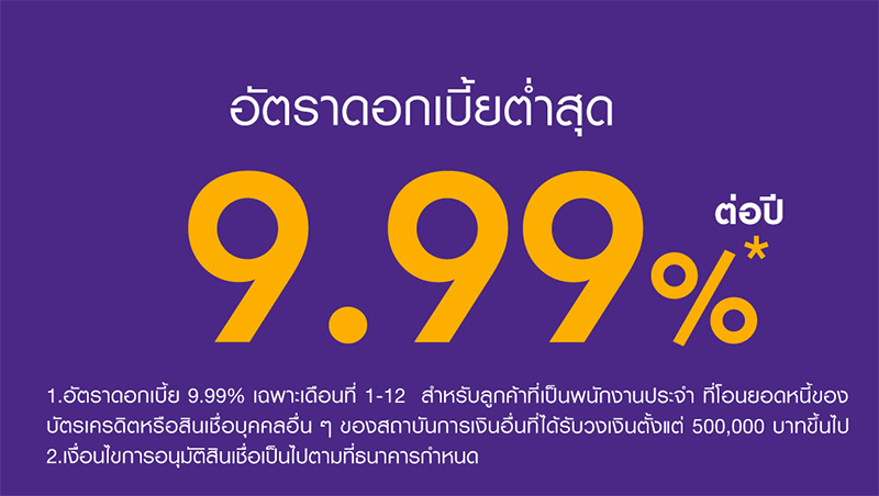 เงื่อนไขการบริการโอนยอดหนี้ของบัตรเครดิตหรือสินเชื่อบุคคลของสถาบันการเงินอื่นอัตราดอกเบี้ยสำหรับสินเชื่อบุคคล Speedy Loan เฉพาะลูกค้าที่ได้รับการอนุมัติวงเงินสินเชื่อบุคคล Speedy Loan และสมัครใช้บริการโอนยอดหนี้ของบัตรเครดิตหรือสินเชื่อบุคคลของสถาบันการเงินอื่น ระยะเวลาแคมเปญระหว่างวันที่ 1 มิถุนายน 2564 - 30 มิถุนายน 2564