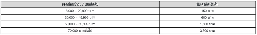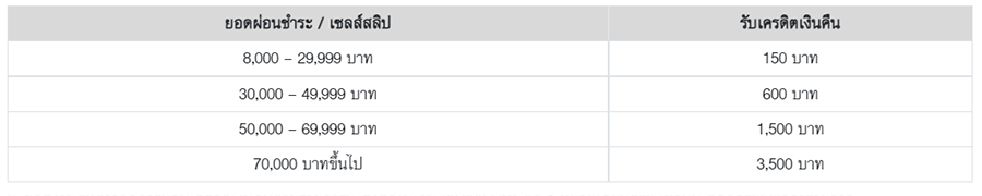 - สมาชิกที่มียอดใช้จ่ายผ่านบัตรฯ ในรายการผ่อนชำระ ณ ร้านค้าที่ร่วมรายการ จะได้รับเครดิตเงินคืนเข้าบัญชีบัตรฯ ของสมาชิกต่อเซลล์สลิป โดยคำนวณจากยอดใช้จ่ายผ่านบัตรฯ ตามที่กำหนด ดังนี้