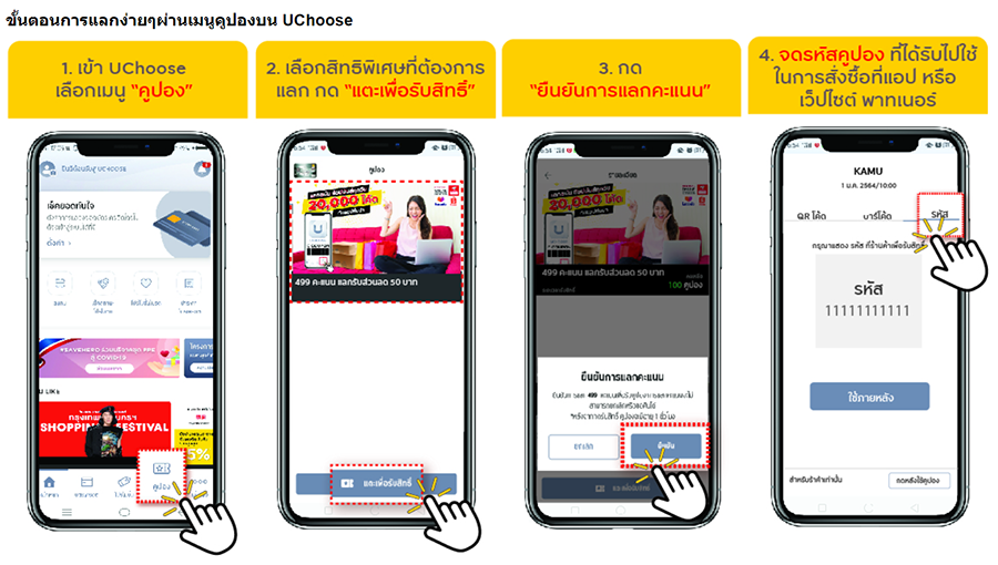 - กรุณากดปุ่ม “แตะเพื่อรับสิทธิ์” เพื่อแลกรับคูปอง โดยใช้รหัส คูปอง ดังกล่าวเป็นส่วนลดในขั้นตอนการชำระเงิน และกดปุ่ม "ร้านค้ากดเพื่อรับสิทธิ์" หลังจากชำระเงินเรียบร้อยแล้วเพื่อยืนยันการใช้สิทธิ์