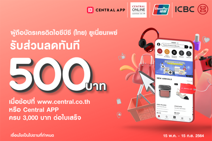 บัตรเครดิตไอซีบีซี (ไทย) ยูเนี่ยนเพย์ รับส่วนลดทันที 500* บาท เมื่อช้อปที่เซ็นทรัล ออนไลน์ www.central.co.th หรือ Central APP ครบ 3,000 บาทต่อใบเสร็จ