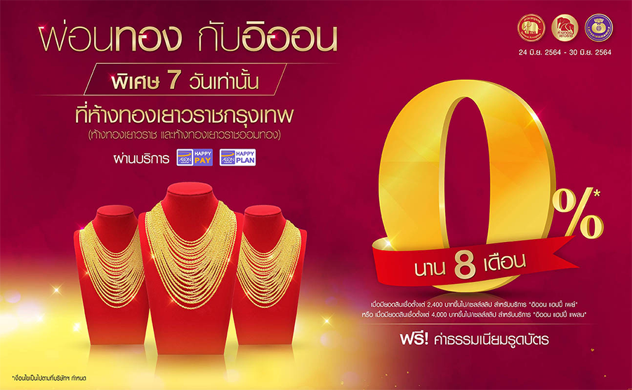 - ผ่อนชำระทองคำ รับอัตราดอกเบี้ย 0% นาน 8 เดือน เมื่อมียอดสินเชื่อตั้งแต่ 2,400 บาทขึ้นไป/เซลส์สลิป สำหรับบริการ "อิออน แฮปปี้ เพย์" หรือเมื่อมียอดสินเชื่อตั้งแต่ 4,000 บาทขึ้นไป/เซลส์สลิป สำหรับบริการ "อิออน แฮปปี้ แพลน"