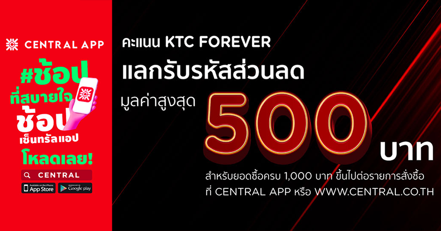บัตรเครดิต KTC ใช้คะแนน KTC FOREVER แลกรับ e-Coupon รหัสส่วนลดสูงสุด 500 บาท ต่อรายการสั่งซื้อที่ Central Application หรือ www.central.co.th