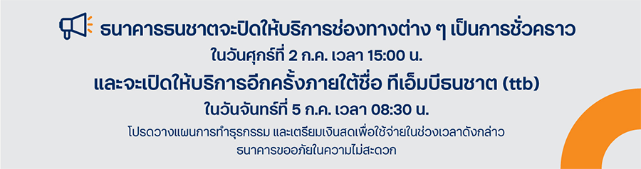 ธนาคารธนชาตขอขอบคุณที่ท่านให้ความไว้วางใจในการใช้บริการของธนาคาร ตลอดมา เพื่อเตรียมพร้อมยกระดับการบริการและส่งต่อประสบการณ์ทางการเงินที่ดียิ่งขึ้นให้กับลูกค้า ธนาคารจะปิดช่องทางบริการต่าง ๆ ในวันศุกร์ที่ 2 ก.ค. 64 เวลา 15:00 น. เป็นต้นไป เพื่อทำการเชื่อมต่อระบบระหว่างทีเอ็มบีและธนาคารธนชาตให้เป็นหนึ่งเดียว