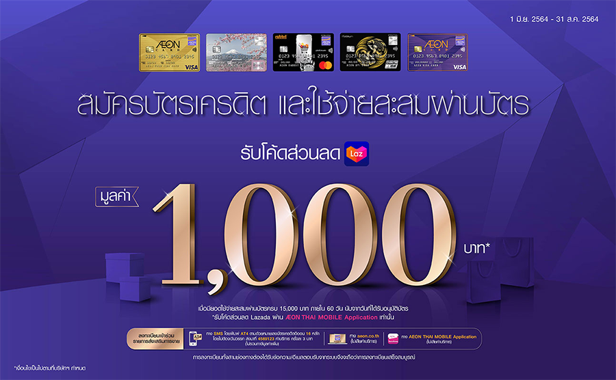 - รับโค้ดส่วนลด 1,000 บาท (500 บาทจำนวน 2โค้ด) ผ่าน AEON THAI MOBILE Application เมื่อมียอดใช้จ่ายผ่านบัตรเครดิตอิออน เจ-พรีเมียร์ แพลทินัม ,บัตรเครดิตอิออน โกลด์ ,บัตรเครดิตอิออน คลาสสิค ,บัตรเครดิตอิอนยูเนี่ยนเพย์ แพลทินัม และบัตรเครดิตอิออนแรบบิท แพลทินัม (ไม่รวมค่าขนส่ง) โดยนำโค้ดส่วนลดไปใช้ที่เว็บไซต์ หรือแอปพลิเคชันลาซาด้าเท่านั้น