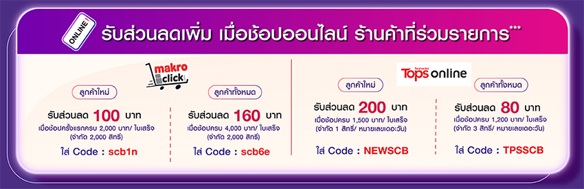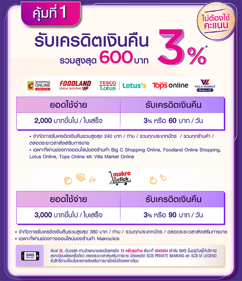 - สำหรับผู้ถือบัตรเครดิตธนาคารไทยพาณิชย์ ยกเว้น บัตรเครดิตนิติบุคคล (“ผู้ถือบัตร”) ที่ชำระค่าสินค้าแบบเต็มจำนวนผ่านบัตรเครดิตผ่านช่องทางออนไลน์ของร้านค้า Big C Shopping Online, Foodland Online Shopping, Lotus Online, Tops Online และ Villa Market Online สำหรับยอดใช้จ่าย 2,000 บาทขึ้นไป / ใบเสร็จ รับเครดิตเงินคืน 60 บาท / วัน และเมื่อมียอดใช้จ่าย 3,000 บาทขึ้นไป / ใบเสร็จ รับเครดิตเงินคืน 90 บาท / วัน ผ่านช่องทางออนไลน์ของร้านค้า Makroclick ตั้งแต่วันที่ 16 มิถุนายน 2564 - 31 กรกฎาคม 2564