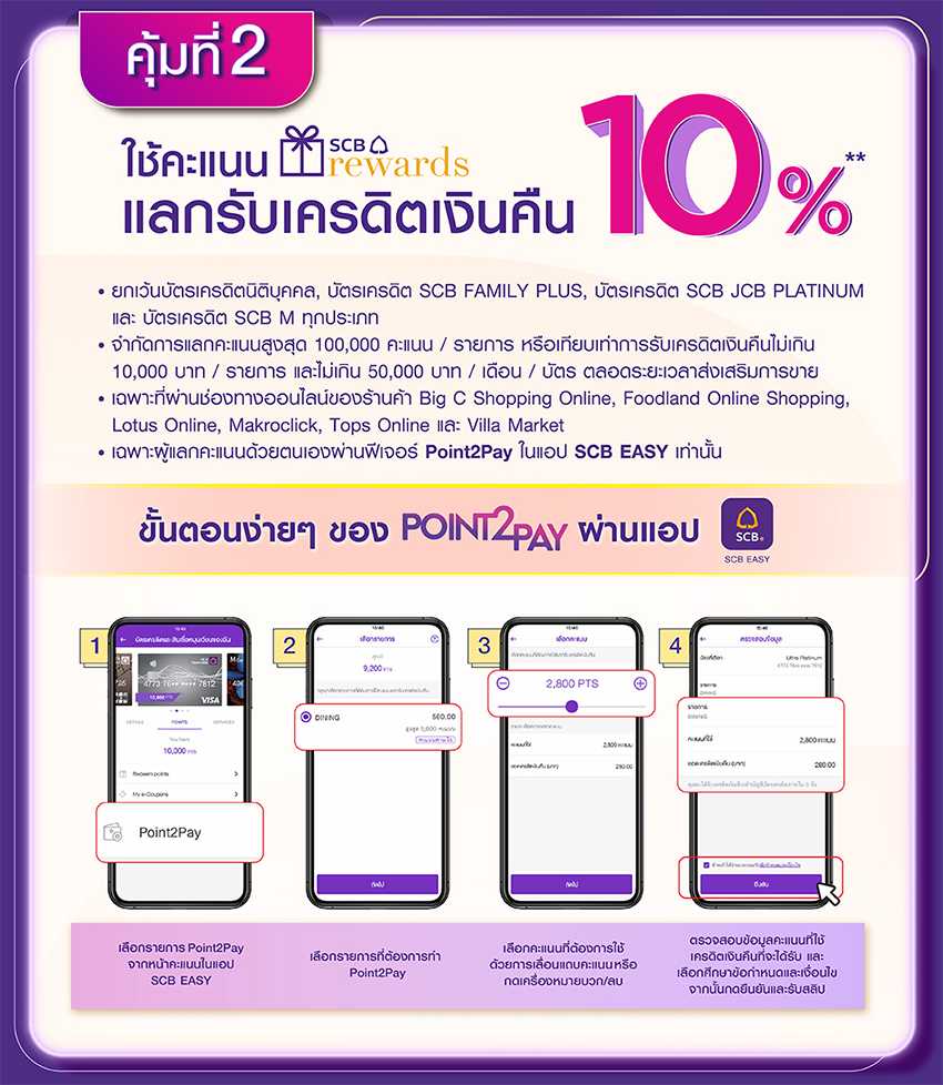 **เงื่อนไขการใช้คะแนนแลกรับเครดิตเงินคืน - สำหรับผู้ถือบัตรเครดิตธนาคารไทยพาณิชย์ ยกเว้น บัตรเครดิตนิติบุคคล, บัตรเครดิต SCB FAMILY PLUS, บัตรเครดิต SCB JCB PLATINUM และบัตรเครดิต SCB M ทุกประเภท (“ผู้ถือบัตร”) ที่ชำระค่าสินค้าแบบเต็มจำนวนผ่านช่องทางออนไลน์ของร้านค้า Big C Shopping Online,Foodland Online Shopping, Lotus Online, Makroclick, Tops Online และ Villa Market Online ผ่านบัตรเครดิต โดยสามารถใช้คะแนนสะสม SCB Rewards เพื่อแลกรับเครดิตเงินคืน10% เข้าบัญชีบัตรเครดิตได้ด้วยตัวเองผ่านฟีเจอร์ Point2Pay ในแอปพลิเคชัน SCB Easy App ตั้งแต่วันที่ 16 มิถุนายน 2564 - 31 กรกฎาคม 2564