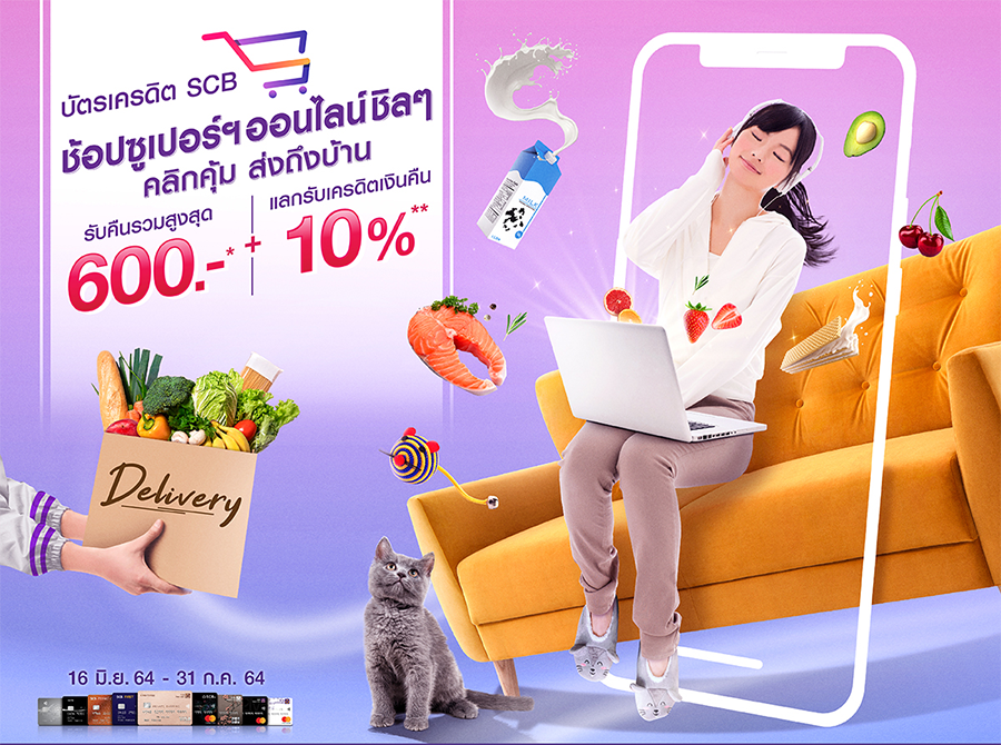 สิทธิพิเศษสำหรับลูกค้าผู้ถือบัตรเครดิตธนาคารไทยพาณิชย์ อยู่บ้านช้อปซูเปอร์ฯ ออนไลน์ รับเงินคืนสูงสุด 600 บาท + แลกรับเงินคืน 10% ที่ Big C Shopping Online, Foodland Online Shopping, Lotus Online, Tops Online และ Villa Market Online