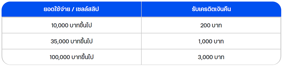 - ยอดใช้จ่ายดังกล่าว ไม่รวม ยอดใช้จ่ายในเชิงธุรกิจ สินค้าผ่อนชำระ ยอดใช้จ่ายที่ถูกยกเลิก และยอดใช้จ่ายที่มีการคืนสินค้าภายหลัง และสินค้าผ่อนชำระ