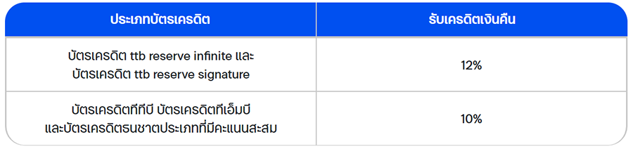 - แลกรับเครดิตเงินคืนสูงสุด 12% สำหรับบัตรเครดิต ttb reserve และ 10% สำหรับบัตรเครดิตอื่น ๆที่มีคะแนนสะสมภายในบัตร โดยใช้คะแนนสะสมเท่าสมเท่ายอดซื้อต่อเซลล์สลิป ขั้นต่ำ 1,000 บาทขึ้นไป