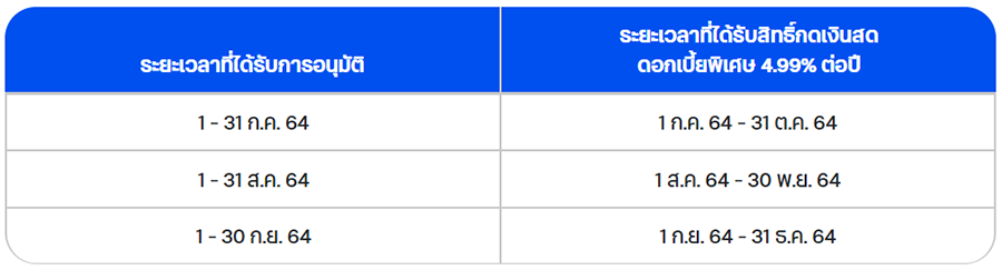 - การคำนวณอัตราดอกเบี้ยพิเศษ 4.99% ต่อปี ของลูกค้าแต่ละราย ต้องเป็นการกดใช้เงินภายในระยะเวลาที่ได้รับสิทธิ์ตามตารางเท่านั้น และอาจมีจำนวนวันที่ใช้ในการคำนวณอัตราดอกเบี้ยพิเศษ ในรอบบัญชีแรกไม่ครบ 30 วันขึ้นอยู่กับวันที่ได้รับอนุมัติ และวันที่สรุปรอบบัญชีของลูกค้าแต่ละรายเป็นสำคัญ