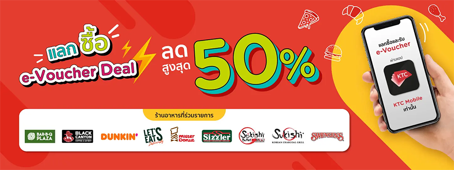 สิทธิพิเศษสำหรับลูกค้าบัตรเครดิต KTC แลกซื้อ e-Voucher ดีลร้านอาหารสุดคุ้ม ในราคา 50% แลกผ่านแอป KTC Mobile ณ ร้านอาหารชื่อดังที่ร่วมรายการ : BAR B Q PLAZA, SIZZLER, BLACK CANYON, SWENSEN’S, MISTER DONUT, DUNKIN’, LET’S EAT Deliciously, SUKISHI BUFFET, SUKISHI KOREAN CHARCOAL GRILL