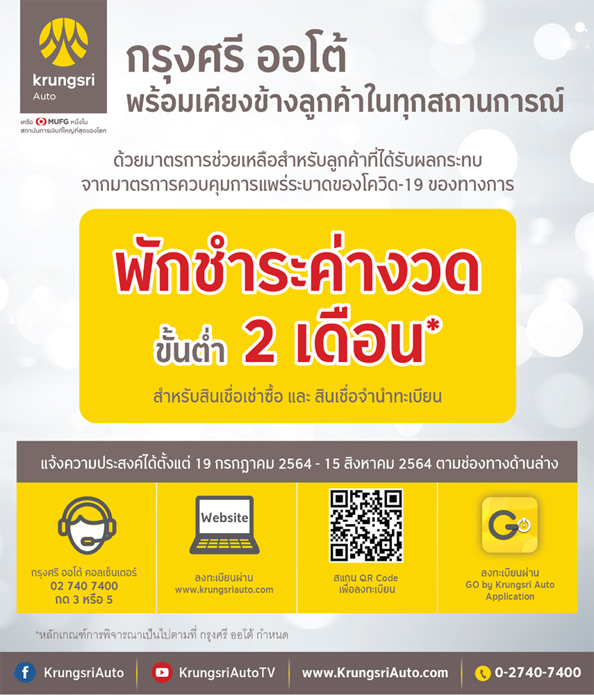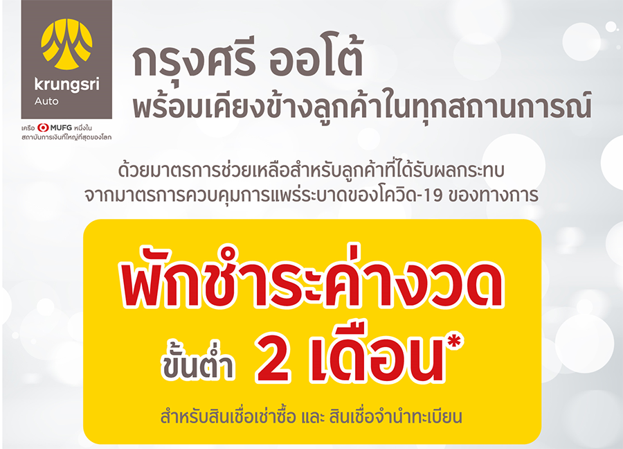 "กรุงศรี ออโต้" ผู้นำธุรกิจสินเชื่อยานยนต์ครบวงจร เครือธนาคารกรุงศรีอยุธยา จำกัด (มหาชน) ประกาศมาตรการช่วยเหลือลูกค้าที่ได้รับผลกระทบจากมาตรการควบคุมการแพร่ระบาดของโควิด-19 เพิ่มเติม ตามแนวทางจากธนาคารแห่งประเทศไทย ผ่านการพักชำระค่างวดขั้นต่ำ 2 เดือน* สำหรับสินเชื่อยานยนต์ทุกประเภท ตอกย้ำความมุ่งมั่นในการยืนหยัดเคียงข้างลูกค้าให้ก้าวผ่านวิกฤตไปได้ในทุกสถานการณ์