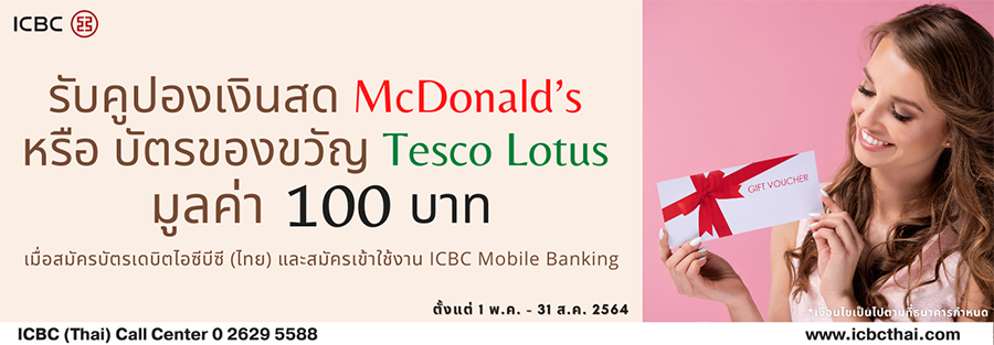 รับคูปองเงินสด McDonald's หรือบัตรของขวัญ Tesco Lotus มูลค่า 100 บาท เมื่อสมัครบัตรเดบิตไอซีบีซี (ไทย) และสมัครเข้าใช้งาน ICBC Mobile Banking