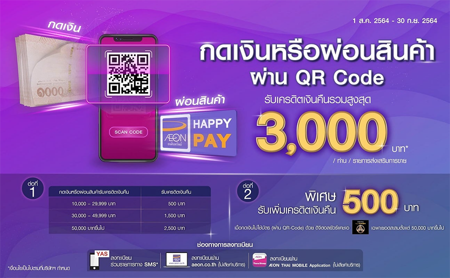 หมายเหตุ : วงเงินเบิกถอนเงินสดเป็นไปตามวงเงินที่ได้รับอนุมัติจากบริษัทฯ ยอดที่ผู้ถือบัตรสามารถเบิกถอนเงินสดได้ ขึ้นอยู่กับวงเงินคงเหลือในบัญชี โดยวงเงินสำหรับเบิกถอนเงินสดอาจมีการเปลี่ยนแปลงขึ้นอยู่กับประวัติการชำระเงิน) - บริษัทฯ สงวนสิทธิ์การให้เครดิตเงืนคืน เฉพาะลูกค้าที่ทำรายการ เบิกถอนเงินสด และ/หรือผ่อนชำระสินค้า โดยไม่ใช้บัตร(ผ่านการสแกน QR CODE) เท่านั้น ลูกค้าที่ทำรายการโดยใช้บัตร ไม่สามารถรวมยอดกับการใช้บริการเบิกถอนเงินสด และ/หรือผ่อนชำระสินค้า (AEON Happy Pay) ผ่านรายการส่งเสริมการขายนี้ได้