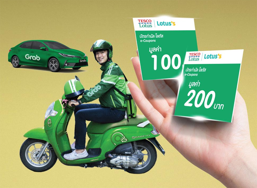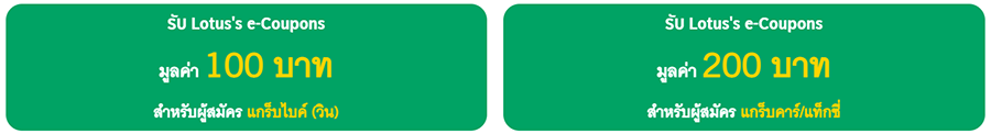 - ผู้สมัครที่ลงทะเบียนเป็นพาร์ทเนอร์แกร็บไบค์ (วิน) จะได้รับ Lotus's e-Coupons มูลค่ารวม 100 บาท (Lotus's e-Coupons มูลค่า 50 บาท จำนวน 2 e-Coupons) ส่วนผู้สมัครที่ลงทะเบียนเป็นพาร์ทเนอร์แกร็บคาร์/แท็กซี่ จะได้รับ Lotus's e-Coupons มูลค่ารวม 200 บาท (Lotus's e-Coupons มูลค่า 50 บาท จำนวน 4 e-Coupons)