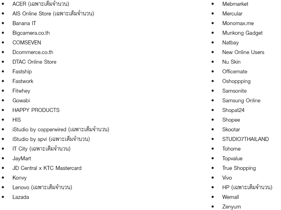 - เงื่อนไขอื่นๆ ที่มิได้กำหนดในรายการนี้ให้เป็นไปตามที่ร้านค้า/ผู้ขายสินค้า/ผู้ให้บริการกำหนด โปรดตรวจสอบเงื่อนไขก่อนการซื้อสินค้า/บริการ
