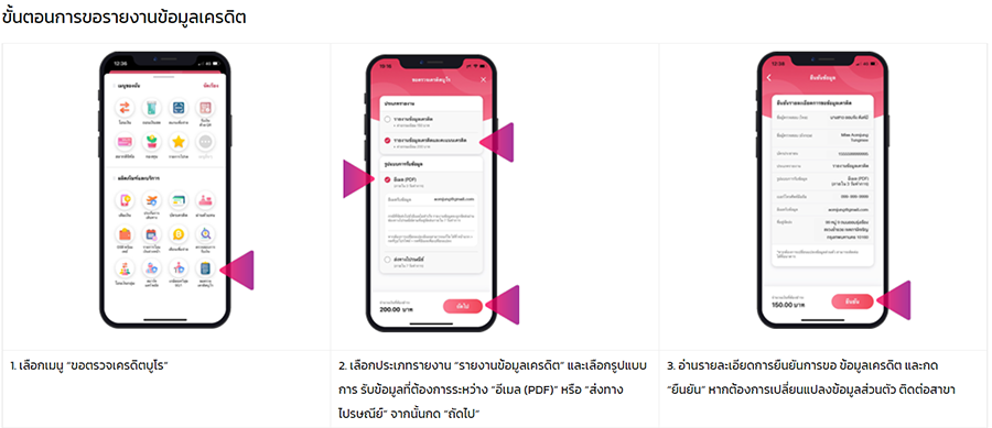 - ธนาคารกรุงไทย Krungthai NEXT : ตรวจข้อมูลเครดิต และเครดิตสกอริ่งรับรายงาน (NCB e-Credit Report) ทางอีเมล ภายใน 24 ชม. (*เงื่อนไขเป็นไปตามที่เครดิตบูโรกำหนด)