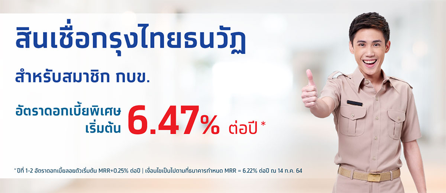 สินเชื่อกรุงไทยธนวัฏ สำหรับสมาชิก กบข. อัตราดอกเบี้ยพิเศษเริ่มต้น 6.47% ต่อปี
