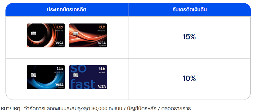 คุ้มที่ 2 : แลกรับเครดิตเงินคืนสูงสุด 15% เมื่อแลกคะแนนสะสม ttb rewards plus เท่ายอดใช้จ่าย