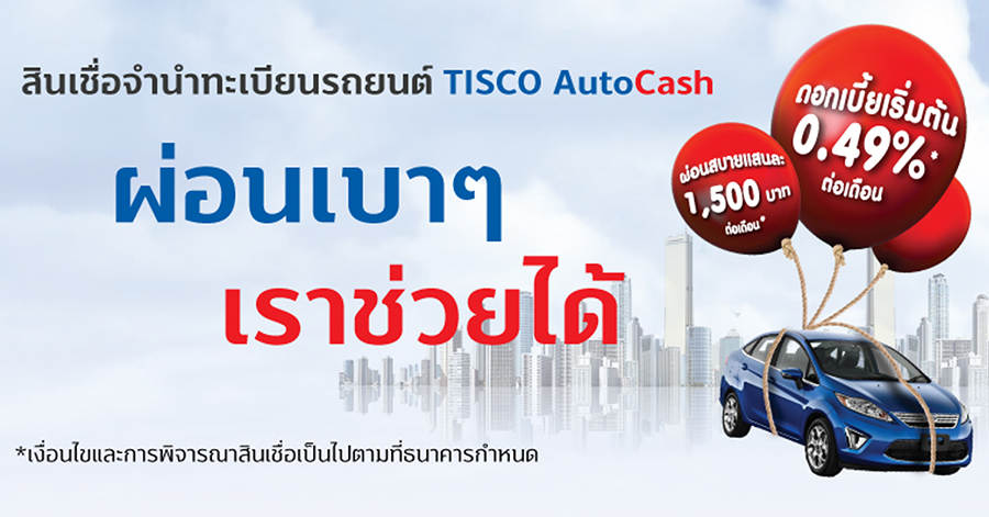 สินเชื่อจำนำทะเบียนรถยนต์ TISCO AutoCash ผ่อนเบาๆ เราช่วยได้ ดอกเบี้ยเริ่มต้น 0.49% ต่อเดือน วันนี้ถึง 31 ธ.ค. 64