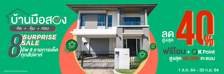 แคมเปญ 8 Surprise Sale บ้านมือสอง ลดสูงสุด 40% ฟรีโอนสูงสุด 80,000 บาท จากกสิกรไทย
