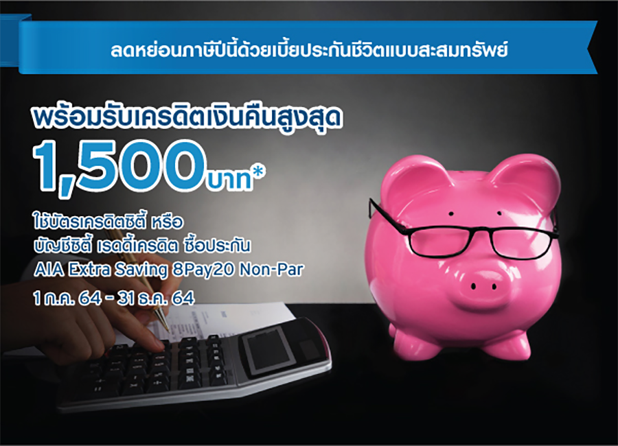 รับเครดิตเงินคืนสูงสุด 1,500 บาท เมื่อใช้บัตรเครดิตซิตี้ หรือบัญชีซิตี้ เรดดี้เครดิต ซื้อประกัน AIA Extra Saving 8Pay20 Non-Par