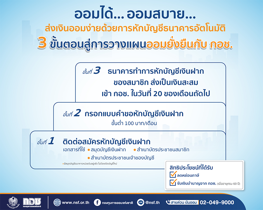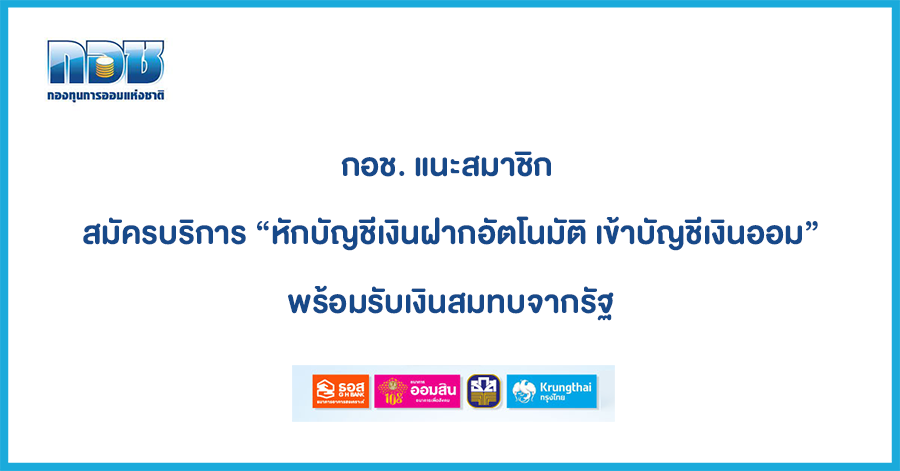 กอช. แนะสมาชิก สมัครบริการ "หักบัญชีเงินฝากอัตโนมัติ เข้าบัญชีเงินออม" พร้อมรับเงินสมทบจากรัฐ