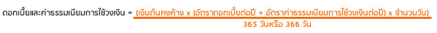 ลำดับการหักยอดบัญชีที่บริษัทเรียกเก็บจากยอดเงินชำระของสมาชิก ภาษีมูลค่าเพิ่ม ค่าธรรมเนียมอื่นๆ เงินต้น ดอกเบี้ย และค่าธรรมเนียมการใช้วงเงินสำหรับบริการเบิกถอนเงินสด และบริการแบ่งชำระ โดยหักยอดผิดนัดชำระ ยอดเรียกเก็บ และยอดที่ยังไม่ถึงกำหนดชำระ (ถ้ามี) ตามลำดับ วิธีการ/ตัวอย่างการคำนวณดอกเบี้ยและค่าธรรมเนียมการใช้วงเงิน สูตร :