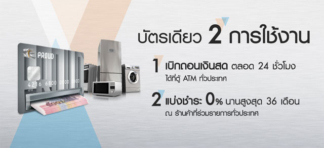 1. เบิกถอนเงินสดตลอด 24 ชั่วโมง ได้ที่ตู้ ATM ทั่วประเทศ อนุมัติรับเงินทันใจ รับเงินโอนเข้าบัญชีภายในวันที่ได้รับการอนุมัติ เมื่อใช้บัญชีธนาคารกรุงไทย ธนาคารกสิกรไทย และธนาคารกรุงเทพ ในการรับเงินโอน และได้รับการอนุมัติภายใน 16.00 น. สะดวก เที่ยงวันยันเที่ยงคืน ทำการเบิกถอนเงินสดได้ตลอด 24 ชั่วโมง ที่ ATM ทุกเครื่องทั่วประเทศ หรือเบิกถอนเงินสดออนไลน์ ผ่านบริการออนไลน์ (www.ktc.co.th/onlineservice ) เข้าบัญชีธนาคารกรุงไทย ภาระไม่หนักเกินไป ชำระขั้นต่ำได้ สามารถชำระค่างวดขั้นต่ำต่อเดือนเพียง 3% ของยอดที่เรียกเก็บ แต่ไม่ต่ำกว่า 300 บาท ยิ่งใช้ ยิ่งได้ รับคะแนนสะสม ใช้แลกแทนค่างวด ดอกเบี้ยฯ หรือสินค้าและบริการ ณ ร้านค้าที่ร่วมรายการทั่วประเทศ (ยกเว้นบริการแบ่งชำระ FLEXI จะไม่ได้รับคะแนนสะสม กดเงินได้เต็มวงเงิน ไม่มีค่าธรรมเนียมการกดเงินสดจากตู้ ATM ทุกธนาคาร ทั้งนี้ การเบิกถอนเงินสดให้เป็นไปตามรายละเอียดด้านล่าง - เบิกถอนขั้นต่ำ 500 บาท ต่อครั้ง - จำนวนครั้งในการเบิกถอน สูงสุด 5 ครั้ง ต่อวัน - จำนวนเงินที่เบิกถอนได้สูงสุด 100,000 บาท ต่อวัน ชำระค่างวด วงเงินเข้าทันที เมื่อชำระที่ธนาคารกรุงไทย หรือที่เคาน์เตอร์เซอร์วิสใน 7-Eleven วงเงินจะคืนกลับ และสามารถเบิกถอนเงินสดได้ทันที 2. แบ่งชำระ 0% นานสูงสุด 36 เดือน ณ ร้านค้าที่ร่วมรายการทั่วประเทศ คว้าทุกความต้องการได้ทันที ด้วยบริการแบ่งชำระ ด้วยอัตราดอกเบี้ยฯ 0% หรือแบ่งชำระได้นานสูงสุด 36 เดือน ณ ร้านค้าที่ร่วมรายการทั่วประเทศ ตัวอย่างสินค้าที่ร่วมรายการก็ถือว่าไม่น้อย เช่น เครื่องใช้ไฟฟ้าในห้างสรรพสินค้าชั้นนำทั่วไป ที่มีป้าย KTC PROUD ต้องใช้บัตรคู่กับรหัสประจำตัว (PIN) ที่ทางบริษัทเจ้าของบัตรให้มา โดยสามารถทำรายการ ได้ดังนี้