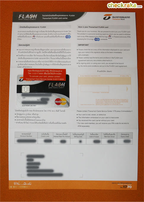 หลังจากที่เราได้รับบัตรเรียบร้อยแล้ว ให้ตรวจสอบความถูกต้องของข้อมูลบนบัตร และอย่าลืมลงลายมือชื่อบนแถบด้านหลังบัตรทันทีด้วยปากกาลูกลื่น โดยต้องใช้ลายมือชื่อเหมือนกับที่ให้ไว้ในใบสมัคร พร้อมศึกษารายละเอียด ข้อกำหนดและเงื่อนไขการเป็นสมาชิกบัตรในสัญญาการใช้บัตรสินเชื่อบุคคลธนชาต FLASH PLUS และเอกสารอื่นๆ ที่แนบมาในซองโดยละเอียด