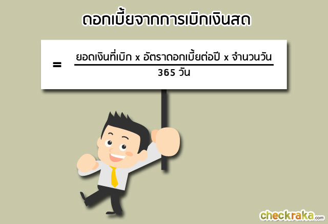 | คิดอัตราดอกเบี้ยตามวันที่ใช้จริง ธนาคารจะคิดดอกเบี้ยโดยคำนวณจากยอดเงินที่เบิก คูณอัตราดอกเบี้ยรายวัน ซึ่งจะเริ่มคิดดอกเบี้ยนับตั้งแต่วันที่ทำรายการ การคำนวณดอกเบี้ยจะคำนวณตามจำนวนวัน ในอัตราดอกเบี้ยซึ่งอนุญาตให้ธนาคารพาณิชย์คิดได้ ตามประกาศของธนาคารแห่งประเทศไทย |